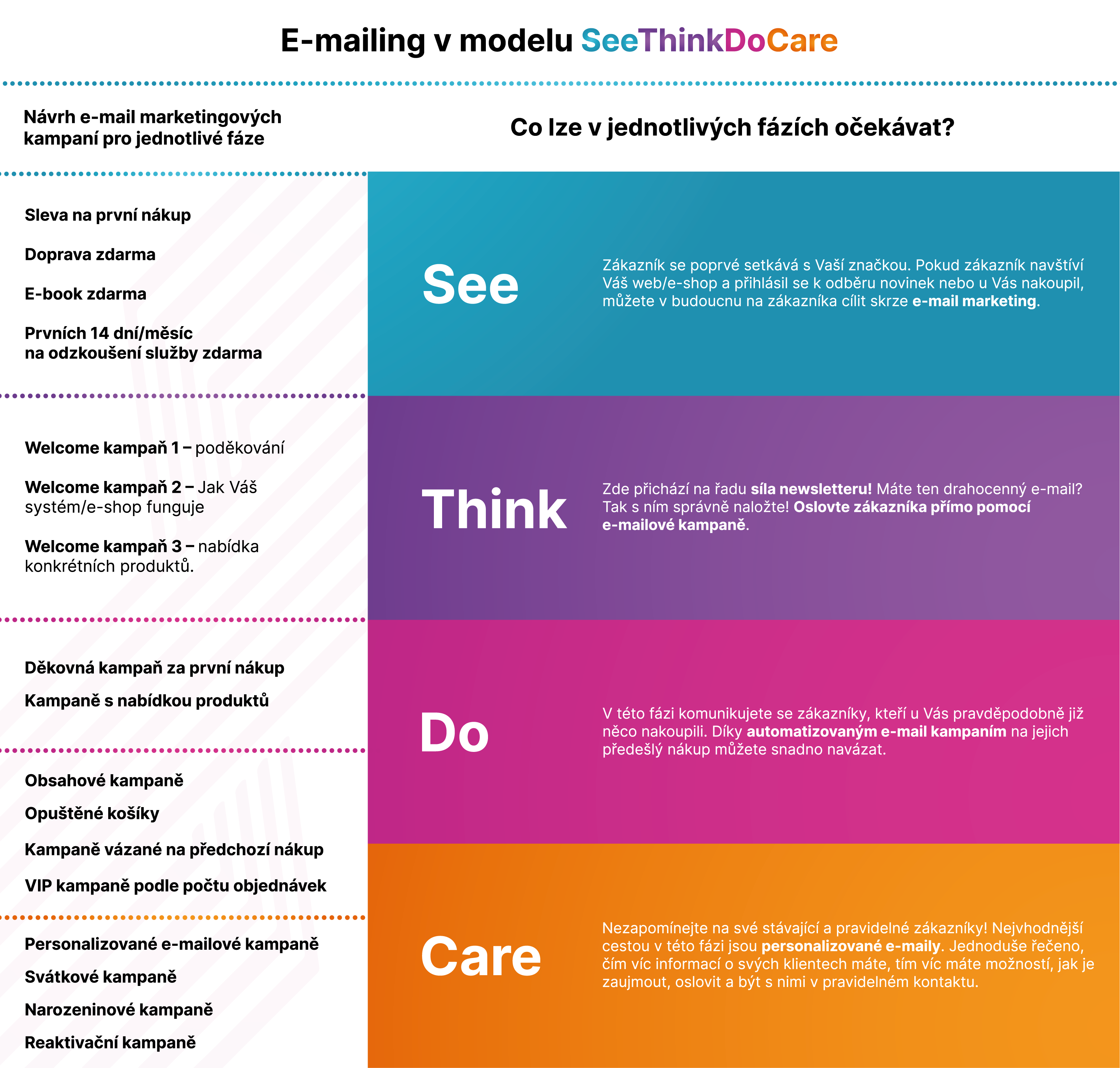 Pro lepší pochopení si to vysvětlíme na modelu See-Think-Do-Care, který se zabývá komunikační cestou od obchodu k cílové skupině a zpět. Jednotlivé fáze jsou uvedené v infografice níže. Jednoduše řečeno, e-mailing můžete využít ve všech uvedených fázích, což vám umožní udržovat se zákazníky pravidelný kontakt a pokusit se o vybudování silného a loajálního vztahu.