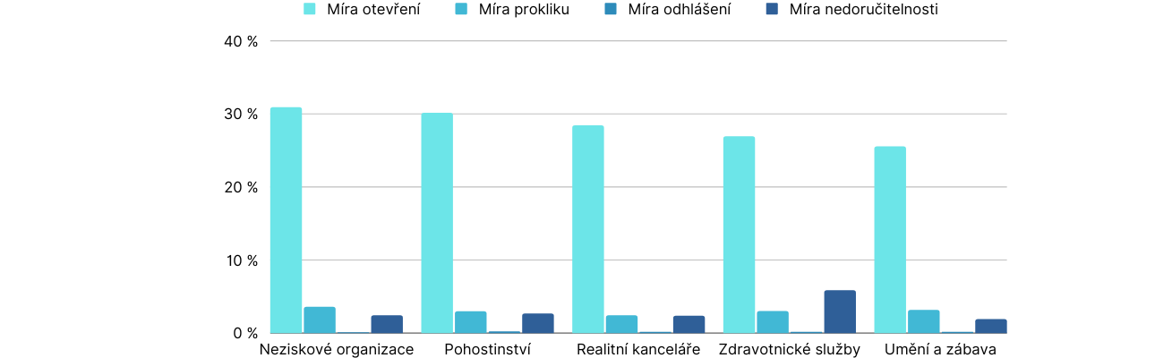 Mezi pět nejlepších odvětví, která si vedou skvěle v míře otevření, lze zařadit neziskové organizace, pohostinství, zdravotnické služby, realitní kanceláře, a umění a zábavu.