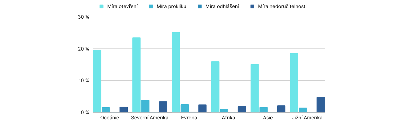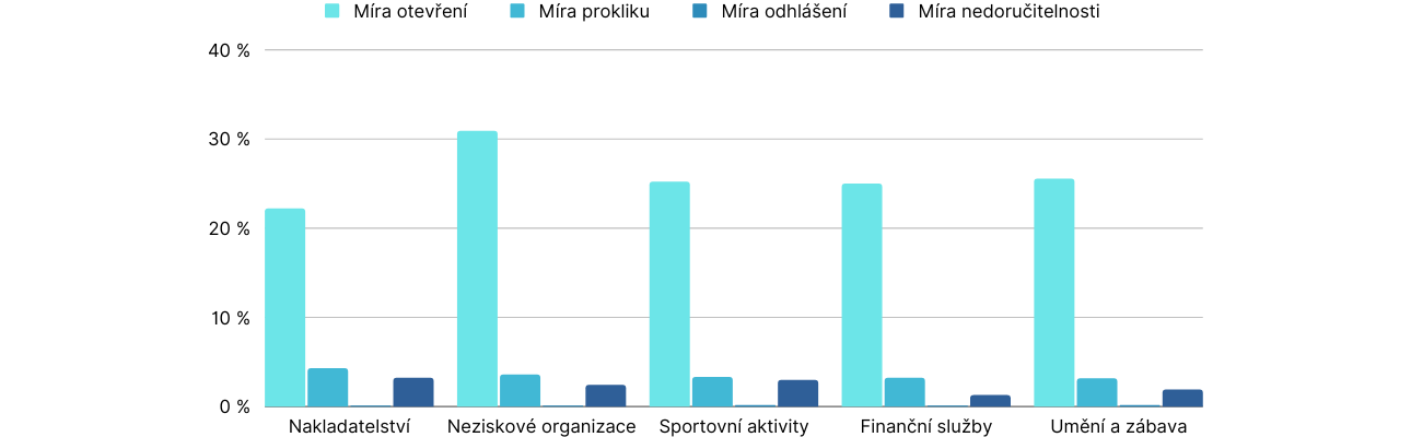 Obor | Míra otevření (%) | Míra prokliku (%) | Míra odhlášení (%) | Míre nedoručení (%) |